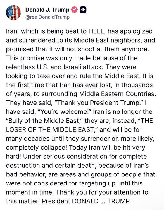 Open Free AccountIran, which is being beat to HELL, has apologized and surrendered to its Middle East neighbors, and promised that it will not shoot at them anymore.